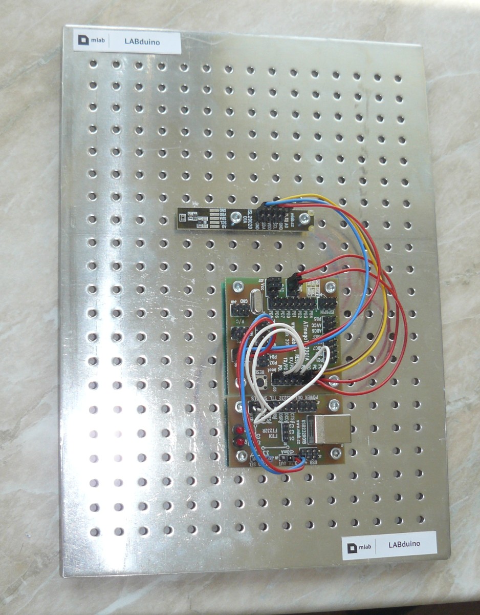 Klasicky se LABduino skládá ze dvou modulů USB232R01B a ATmegaTQ3201A osazený mikroprocesorem ATmega328 tak že signály TXD a RXD se přivedou kablíky na RX a TX (křížené spojení) a řídící signál RTS# od modulu USB232R01B se přivede na jumper označený jako boot (aktivuje bootloader). Napájení modulu ATmegaTQ3201A je obvykle řešeno přímo z USB (připojením napájecího kablíku).
